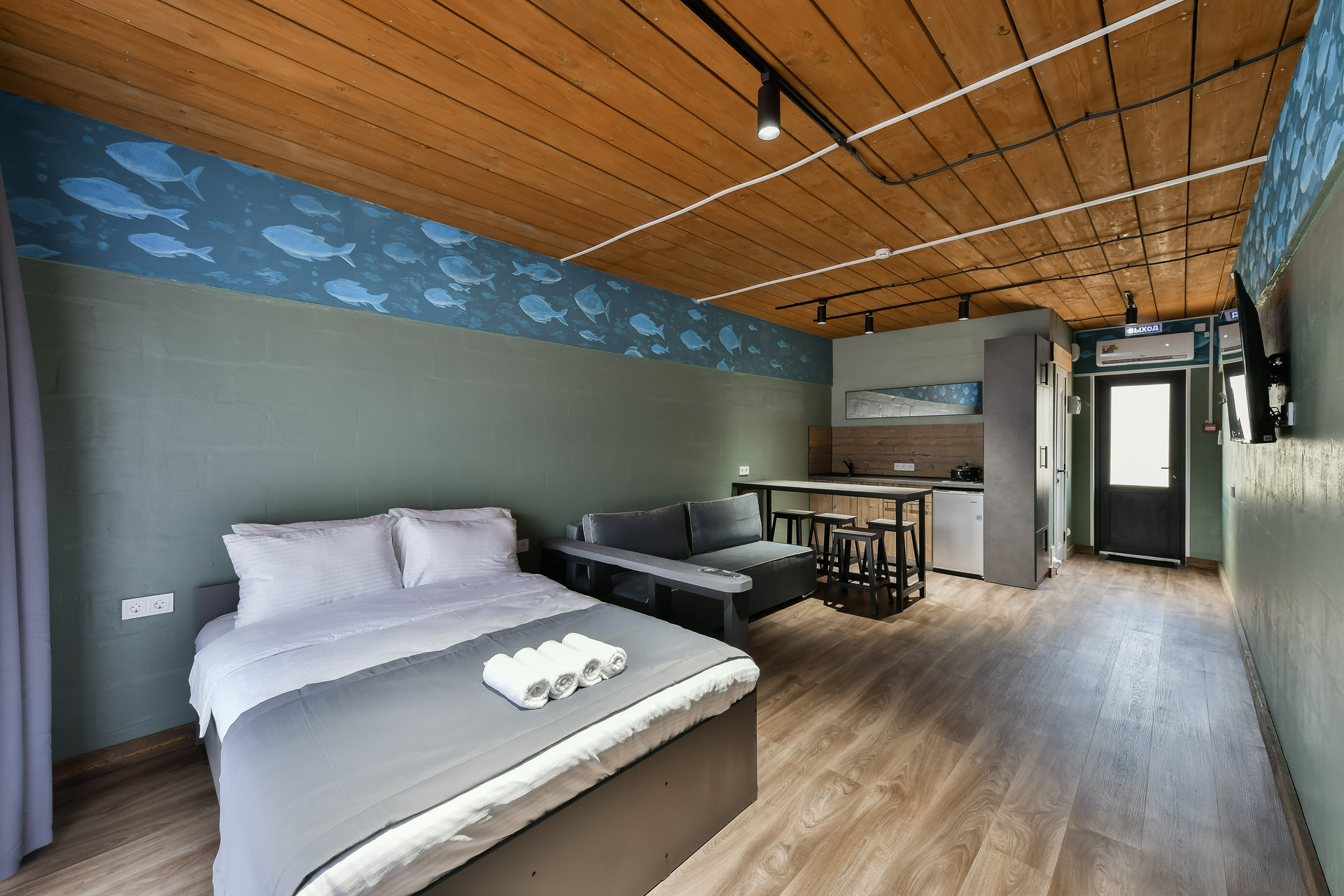 2-х комнатный номер (кухня-гостиная, спальня). Спальня – двуспальная кровать, гостиная – раскладной диван.